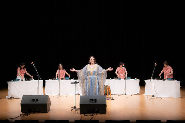 第二部のスタートはシンギング・リンの演奏。5名の奏者が地球・宇宙・魂とつながる音を奏でます。客席では、目を閉じて自分の世界に入っている人も。耳では聞き取りにくい小さな音を全身で受け止めているかのようです。