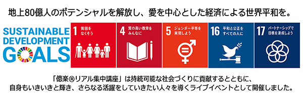 20歳の時は所持金6円、英語力ゼロから3年で同時通訳デビュー。元首相や国連事務総長など、世界の権威3,000名以上を同時通訳し、億万長者の脳の使い方をマスター。地球上の成功法則と宇宙の法則を掛け合わせ、億を楽に引き寄せる「億楽®メソッド」を開発。2020年4月、コロナ禍の家庭に届けるために始めた毎朝6時の「億楽®ライブ」(YouTube配信)は1,515回を数え(2024年6月10日現在)、有益な情報をのべ1,291万人に無料で提供し、視聴者の人生を好転へと導く。地上80億人が無限に豊かで幸せになることを目指し、愛を中心とした経済で日本と世界の貧困撲滅、SDGsの目標達成に向けて尽力する。