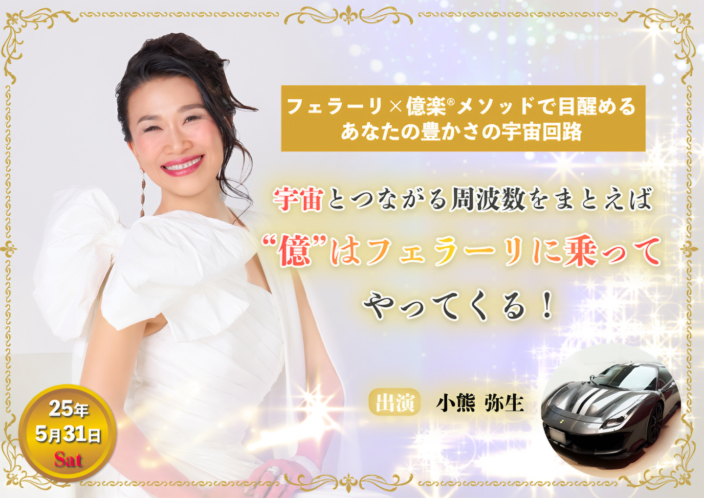 セミナーおよび各種講座の企画・開催、企業研修、コンサルティングなどを手掛ける株式会社ブリッジインターナショナル(本社:東京都港区)の代表取締役・小熊弥生は、2025年5月31日に株式会社KADOKAWA主催のイベント「宇宙とつながる周波数をまとえば、“億”はフェラーリに乗ってやってくる!」に出演します。