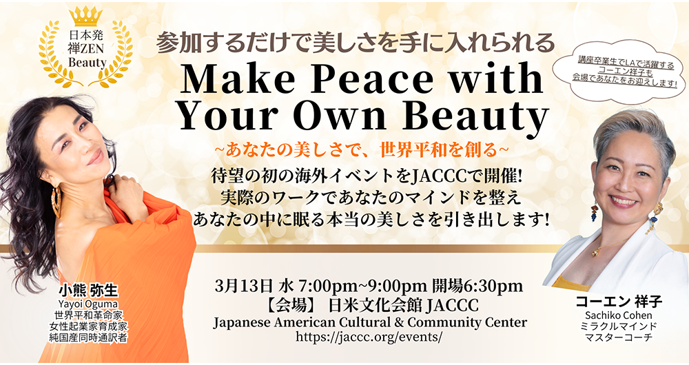 そこで今回、アメリカ・ロサンゼルス(LA)の日米文化会館(JACCC)にて、現地の方々向けのセミナーを開催。小熊が提唱する億楽®メソッドと平和への思いを伝えます。