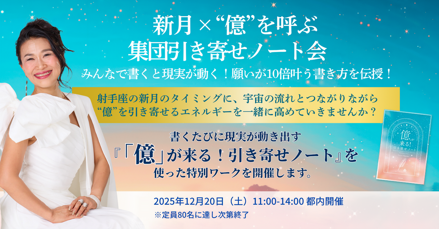 セミナーおよび各種講座の企画・開催、企業研修、コンサルティングなどを手掛ける株式会社ブリッジインターナショナル(本社:東京都港区)は代表取締役・小熊弥生の新刊『「億」が来る! 引き寄せノート』(KADOKAWA)の一般発売を記念して、2025年12月20日に都内でイベント「新月ד億”を呼ぶ 集団引き寄せノート会」を開催します。ノートの具体的な使い方や、願いを形にする書き方を著者自らが伝えます。